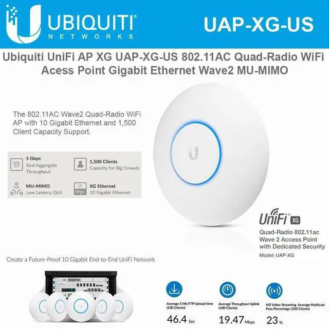 Combining twice the number of 5 GHz radios and four times the associations per radio, the UniFi XG AP delivers an order of magnitude more performance1 than a typical 802.11 ac Wave 1 AP.