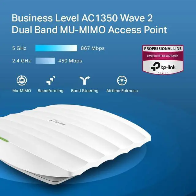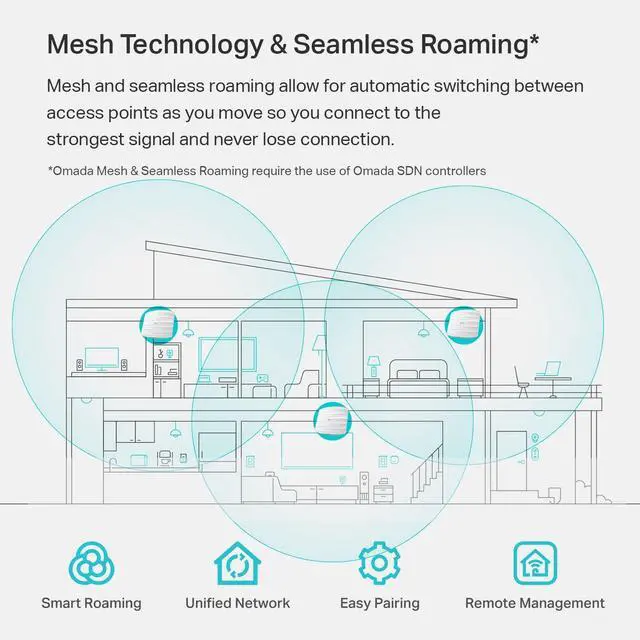 Advanced Wireless TechSupports Mesh WiFi, Seamless Roaming(Omada Mesh & Seamless Roaming require the use of Omada SDN controllers), Band Steering, Airtime Fairness and Beamforming technologies.