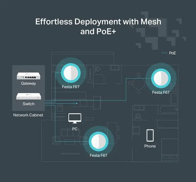 . + : Armed with a 2.5 Gigabit Ethernet port, the Festa F67 delivers exceptional multi-gigabit performance and boosts total internet throughput for faster, better Wi-Fi. Supports standard 802.3at PoE+ and 12V/2A DC power supply, can be powered by a TP-Link PoE+ switch, or the provided 12V/2A DC adapter, making deployment effortless and flexible.
