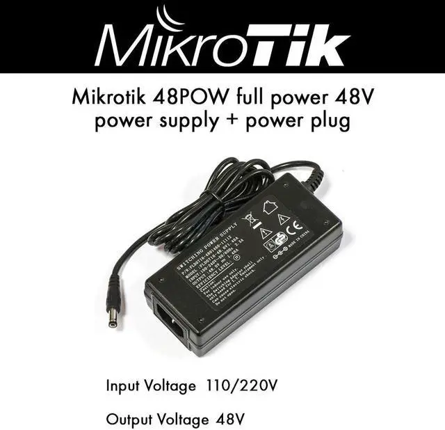 Mikrotik 48POW full power 48V power supply + power plug, 43 watt (. 9 amp) heavy duty switching power supply with 2.1 mm US DC plug.