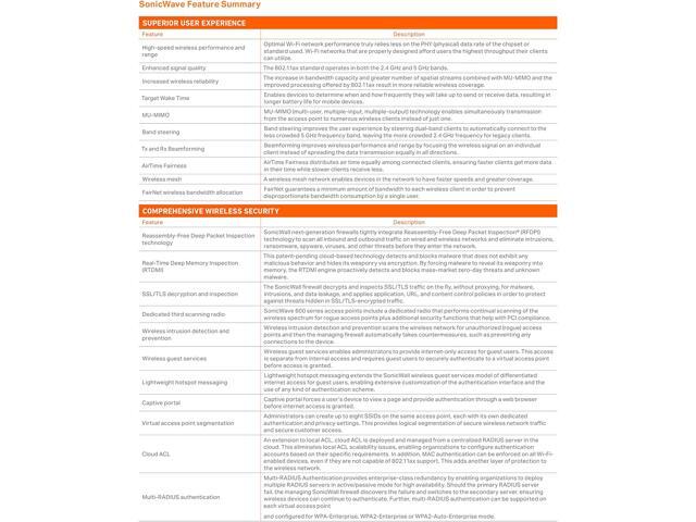 - SonicWall’s 600 series access points (APs) use 802.11ax - the most advanced technology available - for superior performance in high-density, multi-device environments. In addition to performance, these APs offer a number of additional features that provide an enhanced experience, as well as deliver best-in-class security that you expect from SonicWall.