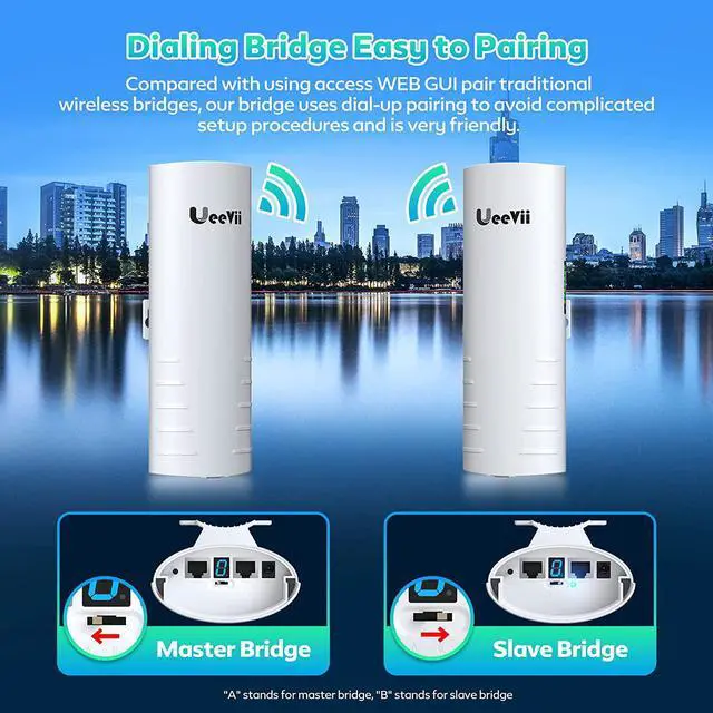 UeeVii CPE-452 is an outdoor high power and 5.8G high-performance wireless bridge, that supports point to point and point to Multi-Point wireless connections. Pairing can be done by dialing without having to access the GUI, making the long-range wireless coverage, data transmission, and wireless monitoring simple and professional, and saving much human work and cost.