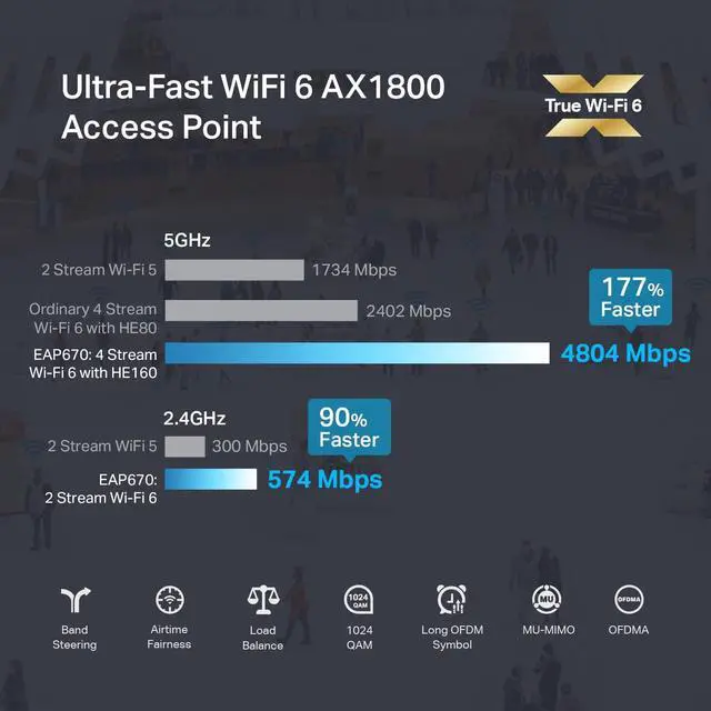 - - : Designed with the latest wireless Wi-Fi 6 technology featuring 1024-QAM, HE60 and Long OFDM Symbol, the EAP670 boosts dual-band Wi-Fi speeds up to 5400 Mbps.