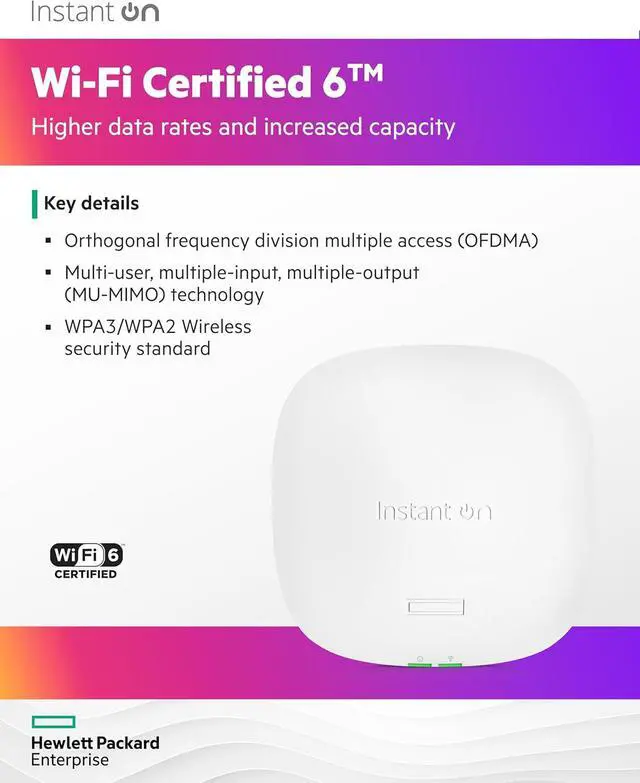 • The Instant On AP25 indoor access point brings the latest Wi-Fi technology - 802.11ax Wi-Fi Certified 6. The Instant On AP25 access point delivers faster Wi-Fi speeds, greater capacity, and reduced latency between access points and devices for a superior Wi-Fi experience. Perfect for gaming, boutique hotels, tech start-ups, and professional offices. Industry-leading 2-year warranty and no extra licensing fees