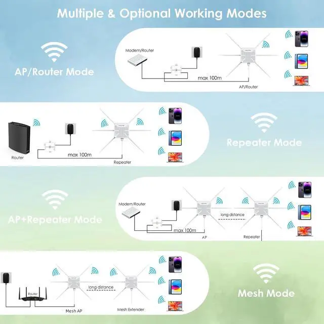 4 Modes to Provide ConnectivitySupports Mesh, AP, Router, Repeater, AP+Repeater and other modes to meet your different needs. Router/AP mode is ideal for converting wired connections into wireless networks, while under Mesh mode you can enjoy seamless WiFi with a single network name and password