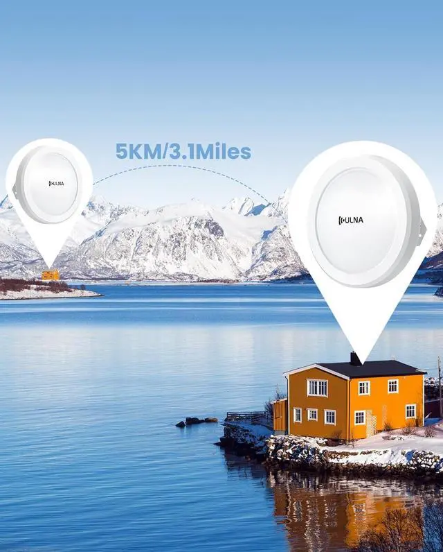 Up to 5 km/3.1 miles: With a large circular antenna, the long-range WiFi bridge outdoor transmission distance is up to 5 KM/3.1 Miles outdoors. Achieve point-to-point long-distance wireless communication without laying cables, reducing wiring costs.