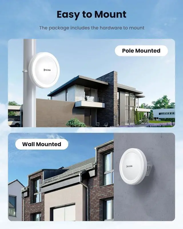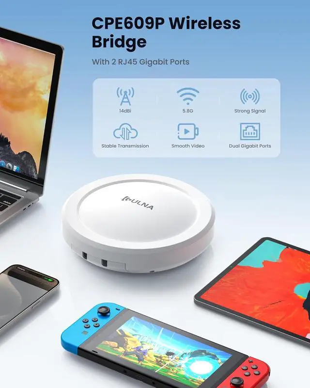 Easy to Use Wireless Bridge: No worries about specialized knowledge, lots of cables, or complex setup; Connect your home network to outbuildings hassle-free, saving a lot of time and money. ULNA CPE609P WiFi wireless bridge is FCC compliant (FCC ID: 2A6ZR-CPE609)