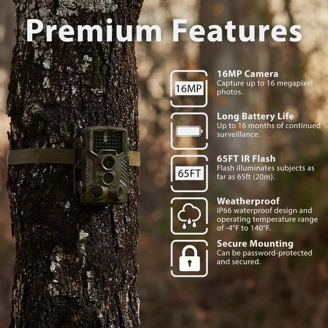 • HD PHOTO AND VIDEO: Capture up to 16 megapixel photos and 1080p video + audio. Time lapse, target recording, and photo series modes allow you to customize your camera to be the perfect surveillance tool for home, work, or the trail. Supports MICRO SD cards up to 32GB (not included).