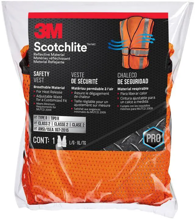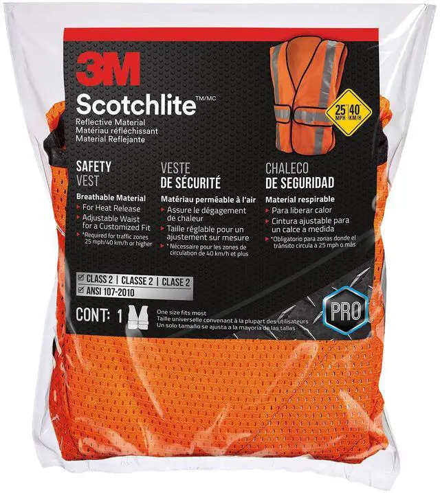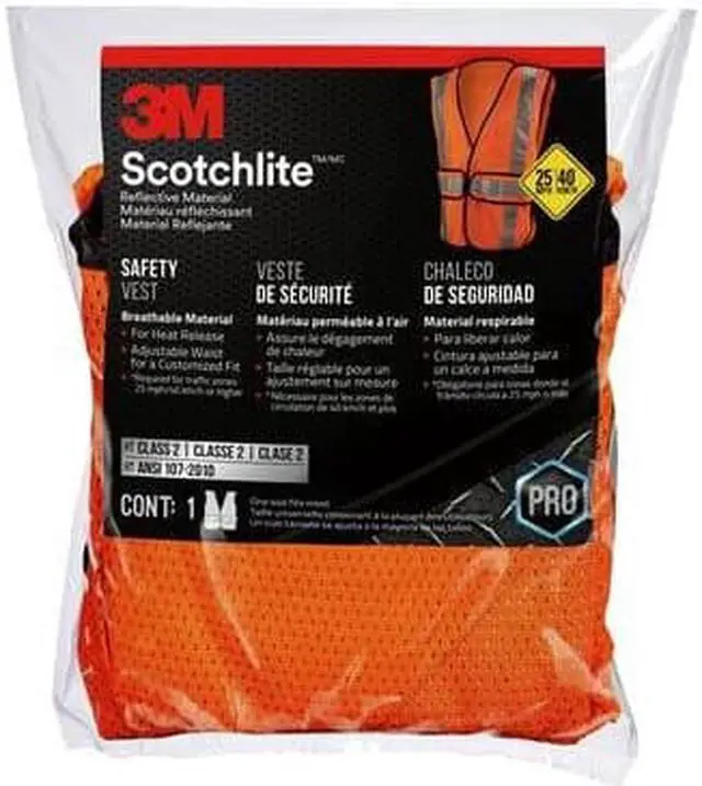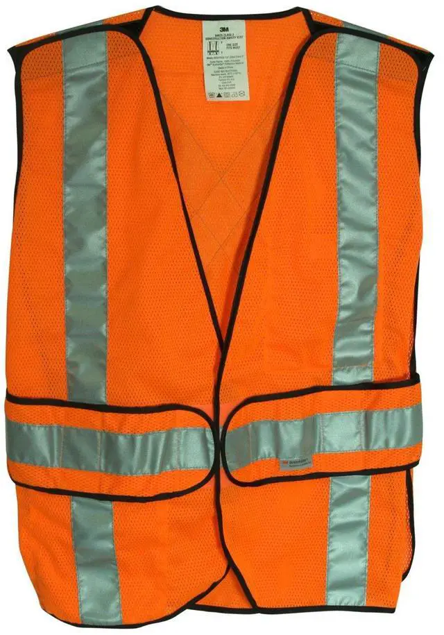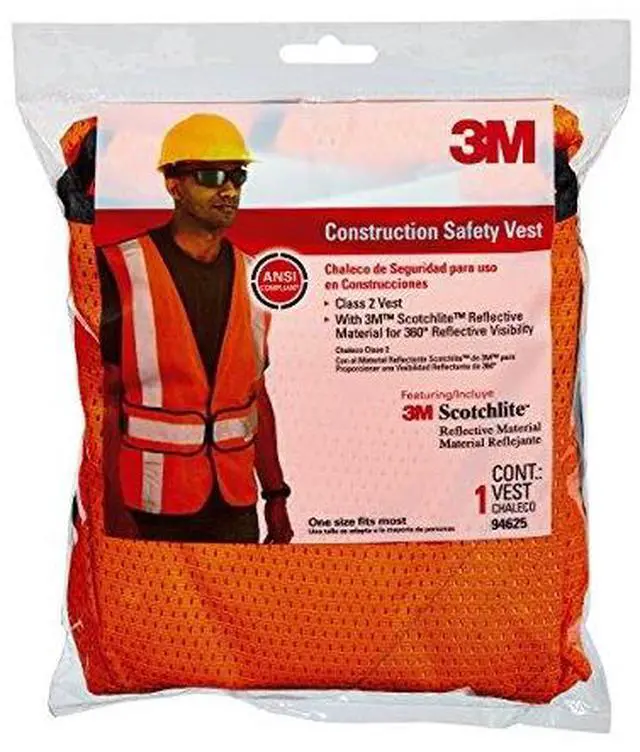 3M (TM) Reflective Clothing, 94625-80030, Hi-Viz Orange Class 2 Construction Safety Vest With 5 Point Tear Away, 5/Cs. The Class 2 Construction Safety Vest Features A 5-Point Tear-Away Design That Helps To Protects The Worker If Vest Is Caught On Moving Equipment. Includes 2 Large Pockets. Hi-Viz Orange Color & 3M Scotchlite (TM) Silver Tape. ANSI 107-2004, FHWA.