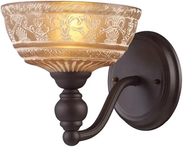 The Amber restoration glass of Norwich collection features a timeless motif that is warm and inviting. The turned center column and ironwork is complemented by an oiled bronze finish (1) 60W Medium Base Bulb Oiled Bronze FinishOverall Dimensions: 8"(H) x 8"(W); 9.5" ExtensionItem Weight: 2 lbs.