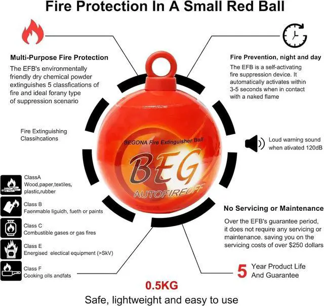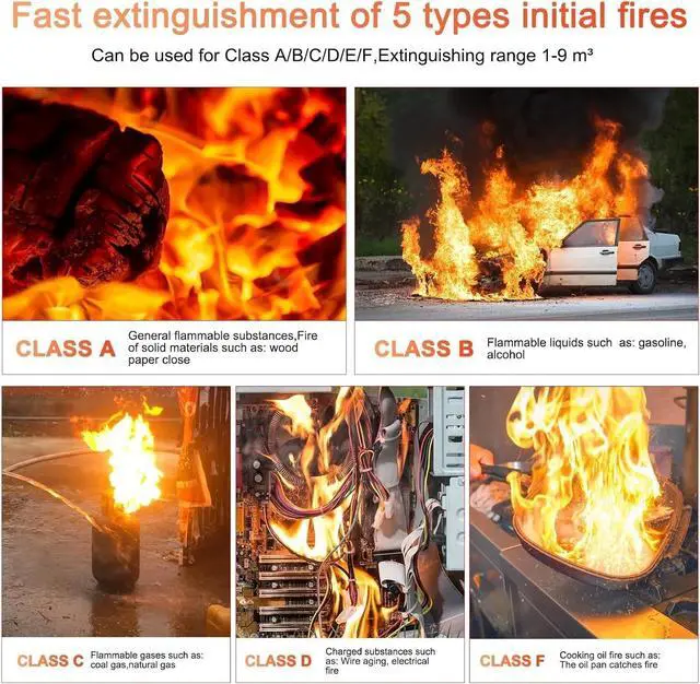 The Begona Multi-Functional Fire Extinguisher Ball is designed to tackle multiple fire types: Class A (solid combustibles), Class B (flammable liquids), Class C (flammable gases), Class E (electrical fires), and Class F (cooking oils). Ideal for kitchens, garages, motor vehicles, gas appliances, and more.