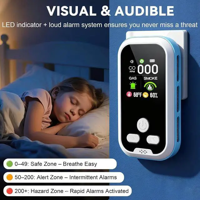 Home Essential & Keep Your Safewhen a Threat Is Detected, This Carbon Monoxide Detector Dual-Alarm System Activates Instantly. An 85db+ Loud Siren Blares, Bright LED Lights Flash Red, And Clear Voice Prompts This Multi-sensory Warning Ensures You're Alerted Day or Night, Even While Sleeping.