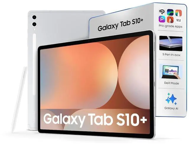 The Samsung Galaxy Tab S10+ Tablet in Moonstone Gray features a stunning 12.4 -inch TFT display with a maximum resolution of 2800 x 1752 pixels, powered by an 8-core Qualcomm Snapdragon processor running at 3.09GH z and 8GB of RAM. It offers 512GB of expandable storage, a 1080p video recording capability, Android 14 operating system, fingerprint reader, and a rechargeable lithium-ion battery that provides up to 15 hours of battery life.