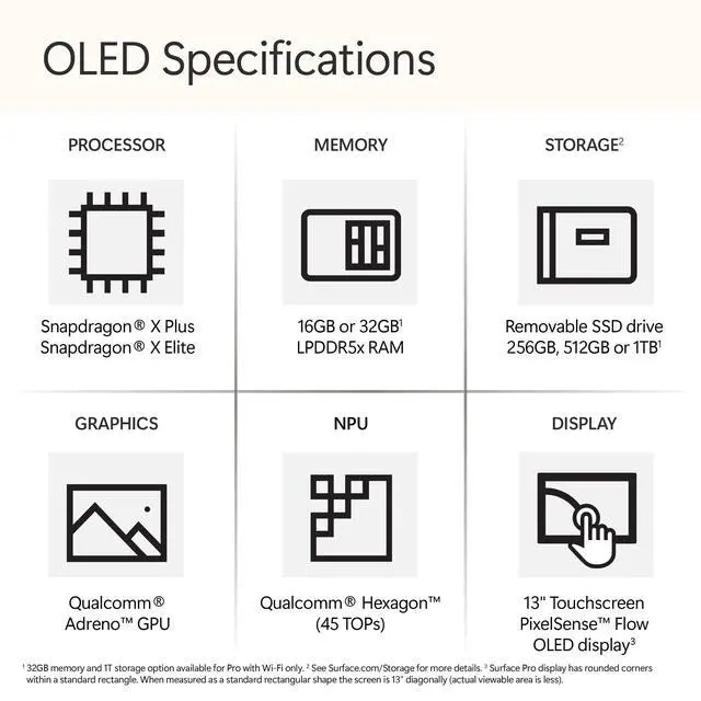 The era of Copilot+ PCs has begun, and it all starts with the Microsoft 13" Surface Pro. Optimized to take full advantage of Microsoft Copilot, the Surface Pro is powered by the Snapdragon X Elite processor. Utilizing the integrated Qualcomm Hexagon NPU, the Surface Pro can handle up to 45 TOPS, allowing for seamless AI integration throughout Windows 11. Add a 13" OLED PixelSense Flow touchscreen, 16GB of RAM, a 1TB SSD, Wi-Fi 7, Bluetooth 5.4, two USB-C ports, and more, and the Surface Pro is ready to handle your workflow with ease.