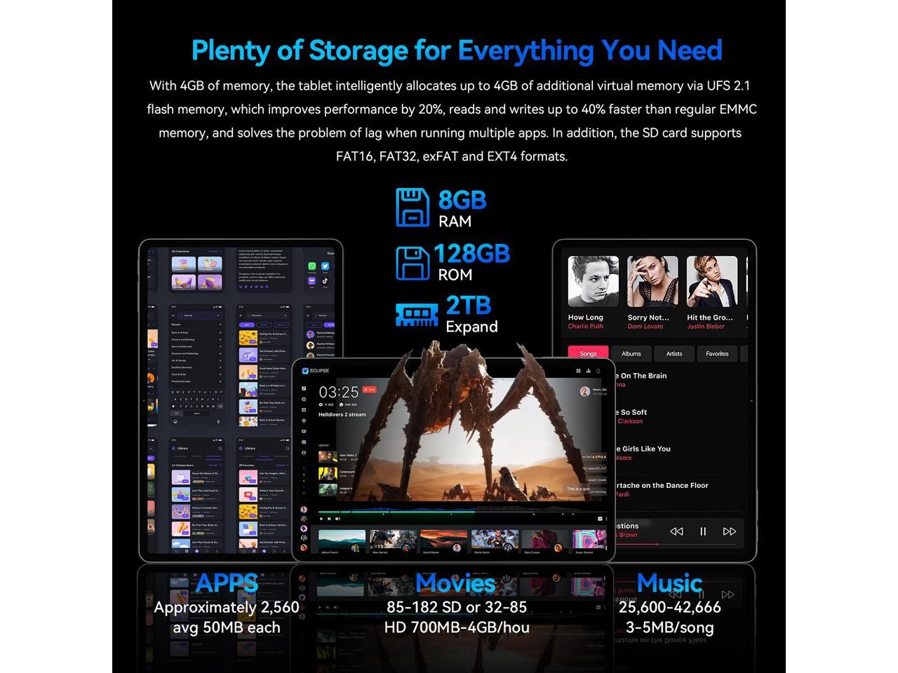 - Large Memory and Storage: The WPad6 Android tablet comes with 8GB RAM (4GB physical + 4GB virtual) and 128GB storage, supporting up to 2TB TF card expansion.