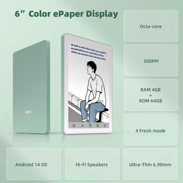 Introducing the Bigme B6 Color Ebook Reader, an innovative 6-inch E-Paper Tablet designed to revolutionize your reading experience. Its sophisticated color E-paper display delivers crisp text and vivid imagery, ensuring a pleasurable reading journey without straining your eyes, even during extended sessions. With a substantial 64GB of internal storage complemented by 4GB of RAM, the Bigme B6 not only facilitates seamless operation but also provides ample space to store an extensive library of thousands of books, magazines, and more. Running on the advanced Android 14 OS, this device opens the door to a plethora of reading apps and personalization options, allowing you to tailor your device to suit your preferences.Beyond its function as an exceptional e-reader, the Bigme B6 stands out for its versatility, adeptly serving as a tablet that caters to varied digital formats and application needs. Whether you're indulging in an immersive novel, perusing vibrant graphic novels, or catching up on essential documents, this device ensures a comprehensive and enriched user experience. Elegant in its black finish, the Bigme B6 Color Ebook Reader is an indispensable companion for the discerning reader, offering a harmonious blend of technology and style, truly setting a new benchmark in the realm of digital reading devices.