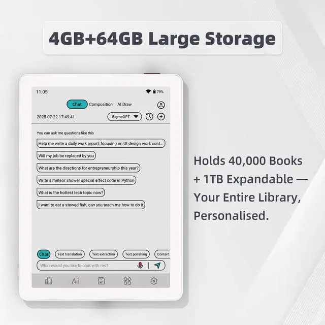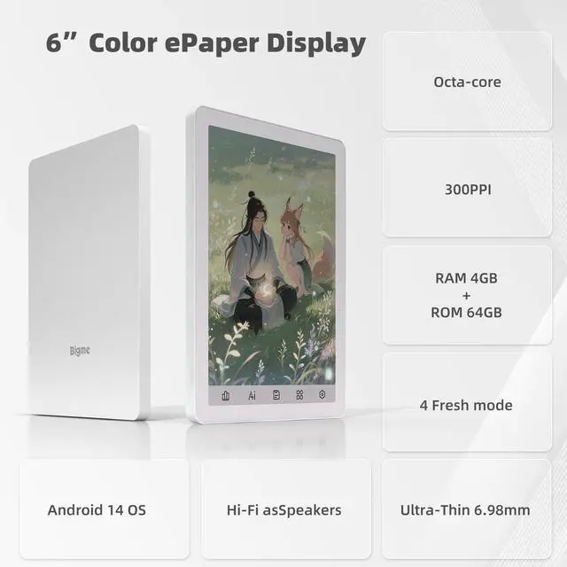 Introducing the Bigme B6 Color Ebook Reader, an innovative 6-inch E-Paper Tablet designed to revolutionize your reading experience. Its sophisticated color E-paper display delivers crisp text and vivid imagery, ensuring a pleasurable reading journey without straining your eyes, even during extended sessions. With a substantial 64GB of internal storage complemented by 4GB of RAM, the Bigme B6 not only facilitates seamless operation but also provides ample space to store an extensive library of thousands of books, magazines, and more. Running on the advanced Android 14 OS, this device opens the door to a plethora of reading apps and personalization options, allowing you to tailor your device to suit your preferences.Beyond its function as an exceptional e-reader, the Bigme B6 stands out for its versatility, adeptly serving as a tablet that caters to varied digital formats and application needs. Whether you're indulging in an immersive novel, perusing vibrant graphic novels, or catching up on essential documents, this device ensures a comprehensive and enriched user experience. Elegant in its black finish, the Bigme B6 Color Ebook Reader is an indispensable companion for the discerning reader, offering a harmonious blend of technology and style, truly setting a new benchmark in the realm of digital reading devices.