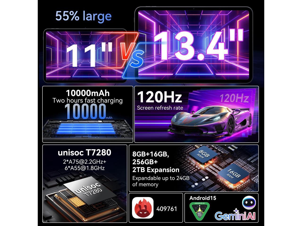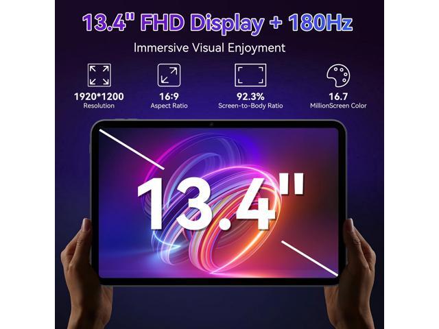 - Immersive 13.4 Inch FHD Display: The 13.4-inch ultra-wide screen, 34% larger than a regular 10-inch tablet, paired with a 120Hz refresh rate, ensures smooth swipes, scrolls, and frames when watching films, gaming, or on Zoom calls. The extra screen space enables effortless split-screen multitasking, suitable for students,creatives,and professionals.