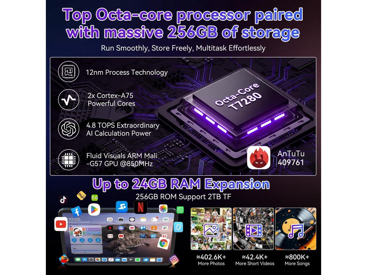 - Lag-Free Power: Switch between gaming, video calls, and apps without slowdown. With 8GB RAM expandable to 24GB, it handles multitasking easily. The 256GB ROM (expandable to 2TB) allows you to download box sets, save 4K movies, or carry your work library.
