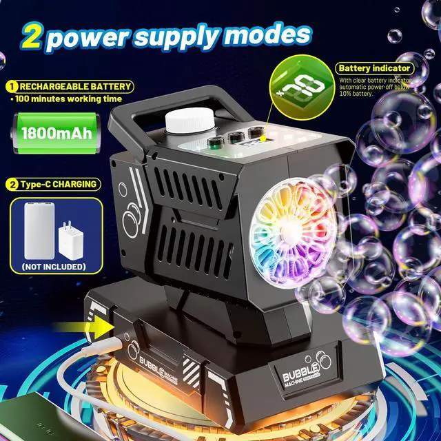 With clear battery indicator,automatic power-off below 10% battery.——USB-C bubble machine