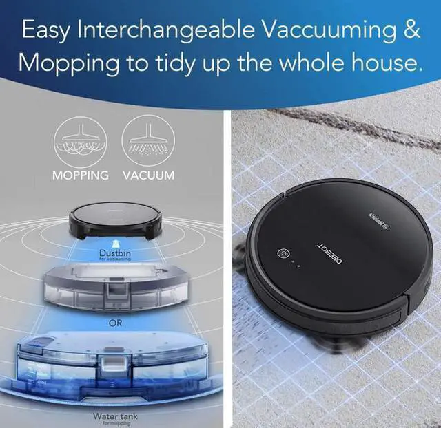 ECOVACS DEEBOT 661 Convertible Vacuuming or Mopping Robot takes care of floor cleaning so you don't have to. Interchangeable dustbin for vacuuming and water tank for mopping to tackle your floor cleaning needs. Three cleaning modes and scheduling accessible from the ECOVACS Home App ensures an effortless, thorough clean while you do things you really love. Its low sound level allows you to have conversations or watch TV while it cleans. Max Mode double suction power to better clean your hard floors and carpets of dirt and dust when needed. The 520ml dustbin allows DEEBOT 661 to take full advantage of 110 minutes of runtime.