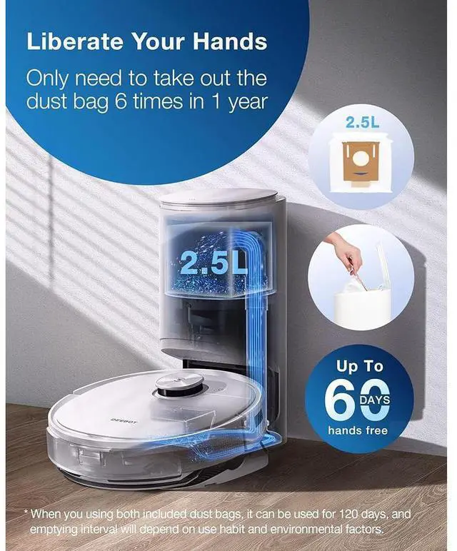 Spreading fragrance: The Air Freshener module has an interchangeable capsule design and comes with a choice of three fragrances. One capsule should last for up to 60 days. OZMO PRO 2.0T he DEEBOT TEO+ is capable of taking on any manner floor surfaces without you breaking into a sweat. With its advanced OZMO Pro feature, it simultaneously sweeps, vacuums and mops your floor to effectively remove stubborn stains off of any floor surfaces. The new OZMO Pro Oscillating Mopping Kit is now also quieter than ever. Ultra-High Suction PowerThe suction power of the DEEBOT TEO+ is doubled. What's more, the DEEBOT TEO+ adopts high-strength fiberglass to maintain steady suction power for a longer lasting clean, and effectively vacuums dust off of both hard floors and carpets. Disposable Mopping PadThe disposable design of the mopping pad is convenient - simply attach, mop and throw it away immediately after use. The microfiber cloth efficiency capture dust, locks away stains and avoids leaving residue. Auto-Empty StationNo longer worry about emptying your dustbin every day. With the included auto-empty station, the DEEBOT TEO+ empties itself into a sealed disposable dust bag that holds up to 30 days of debris.