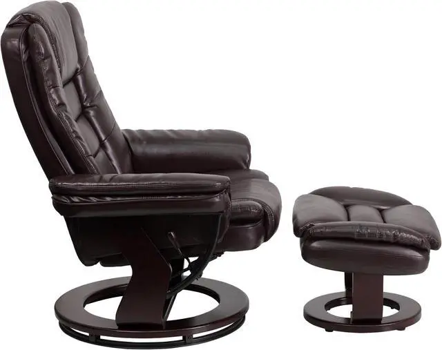There's no better way to enjoy a movie, a book or just some down time than in a recliner. This brown set features thickly padded arms and tastefully exposed wood frames. This uniquely designed recliner features a ball-bearing swivel base that makes turning from one conversation to another effortless. This set is not only perfect in the home, but makes for a great addition in the office. The soft and durable LeatherSoft upholstery allows for easy cleaning with a water based cleaner. For easy maneuverability, this recliner has a ball-bearing swivel base and its ottoman has a wood base with floor glides.