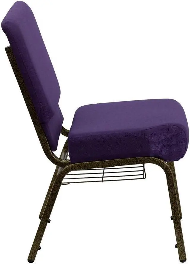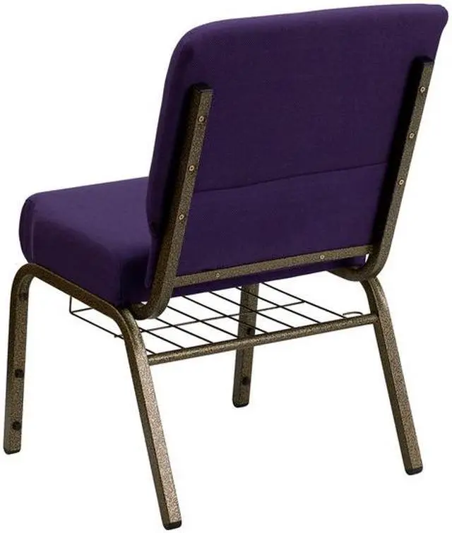 A convenient book pouch on the back of the chair keeps seminar materials, bibles or hymn books readily available and a book rack under the seat gives everyone a place to store their personal belongings. Its sturdy 16 gauge steel, copper vein frame, with gracefully angled legs, has been tested to hold up to 800 pounds and plastic rocker glides protect your floor by sliding smoothly when you need to move the chair. This commercial side chair is an excellent choice for event venues, hotel lobbies, banquet halls, conference facilities and worship centers.