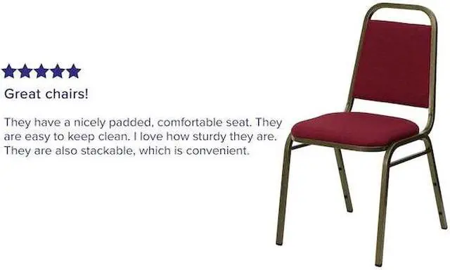Organize events for any occasion with banquet chairs, these stylish ballroom chairs are the right choice for casual and formal events. Built for the commercial industry these trapezoidal back banquet chairs have been tested to hold up to 500 pounds. With a high seating capacity these stack chairs are perfect for the event rental business. This standout hospitality chair can be used as is and still command attention or be dressed up for formal events by placing a chair cover over it. The chair is cushioned with 1.5" thick CAL 117 fire retardant foam and is covered in a durable fabric upholstery.
