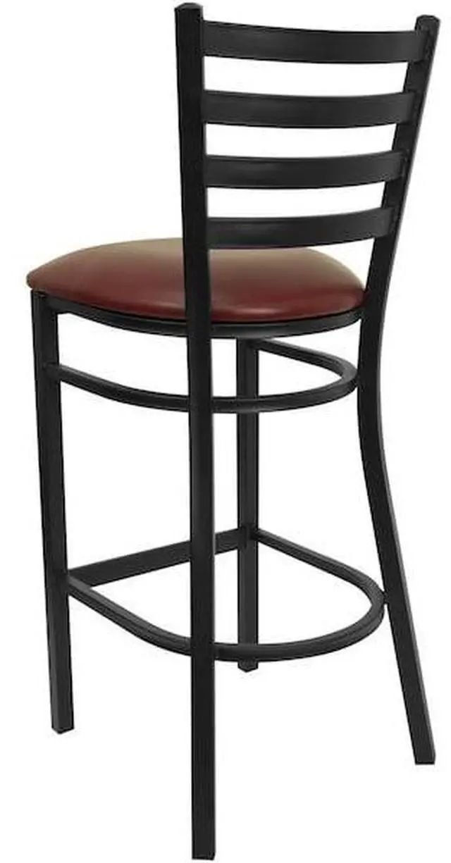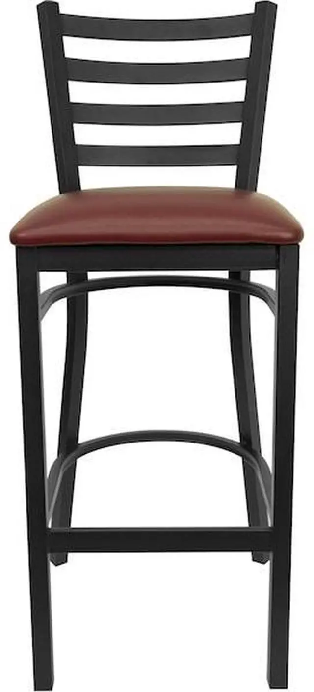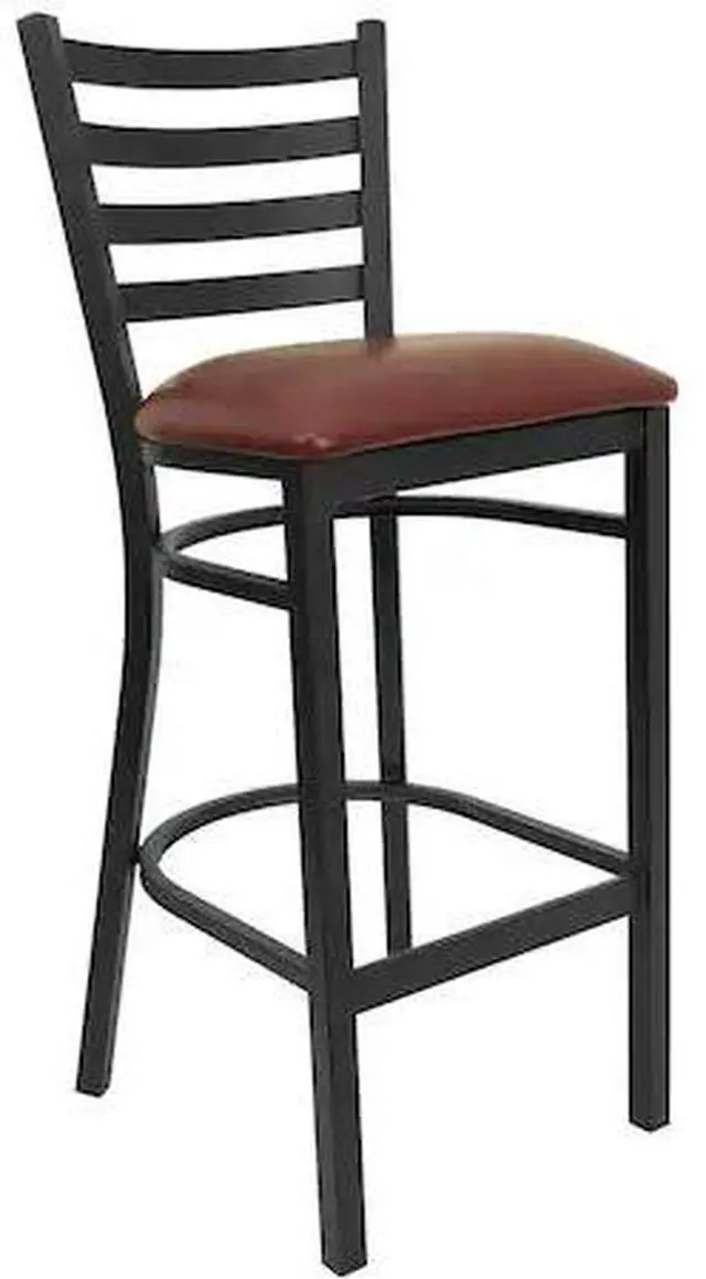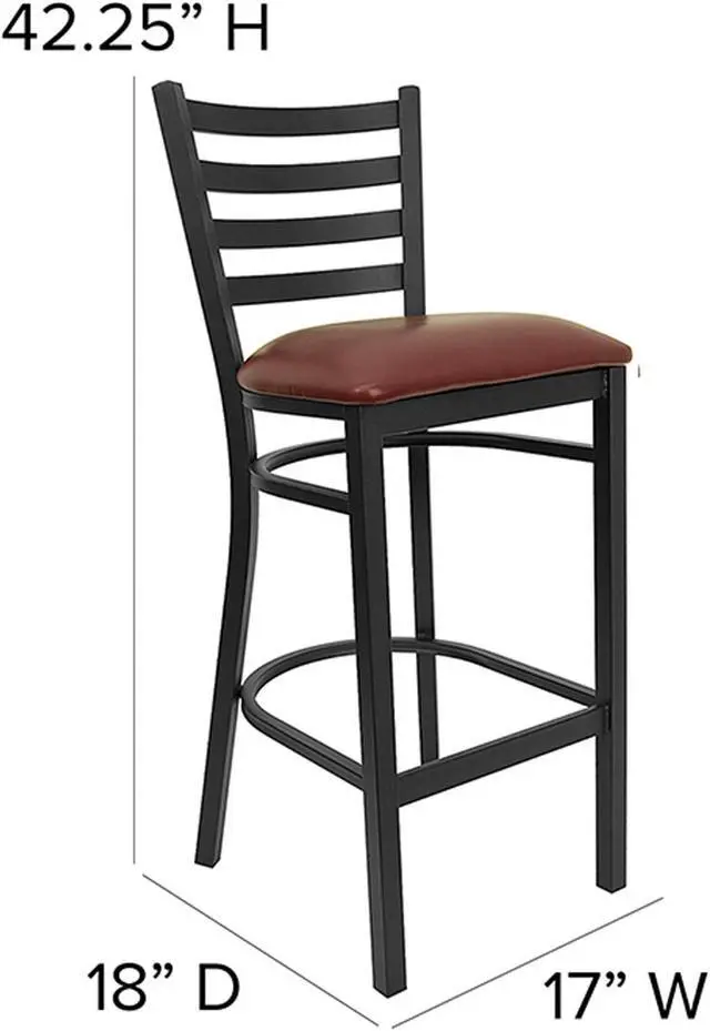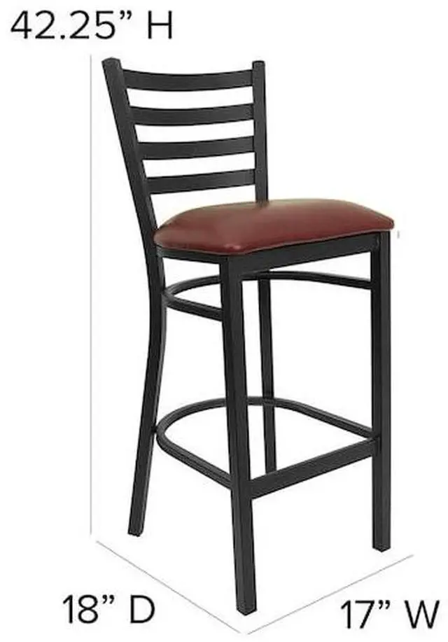 Create a first-rate dining experience by offering your patrons great food, service and attractive furnishings. Commercial furniture needs to be durable and low maintenance so metal barstools are a popular choice for furnishing restaurants, pool halls, lounges, bars and other high traffic establishments. This upholstered stool is easy to clean, which is an important aspect when it comes to a business. Built to withstand the everyday hustle and bustle in the restaurant and hospitality business, these dining stools will also look great in your home. The thick, foam padded seat and ladder back design will keep guests comfortable. The frame is stabilized using two welded support bars, which includes a footrest to prevent leg discomfort. The floor glides help protect your floors and ensure smooth gliding. Use this bar height stool in your kitchen, dining room or home bar and give your decor a fresh look. The simple and lightweight design of this stool will not disappoint, whether used in the home or your commercial business.Product Dimension-17"W x 18"D x 42.25"H
