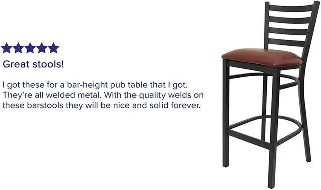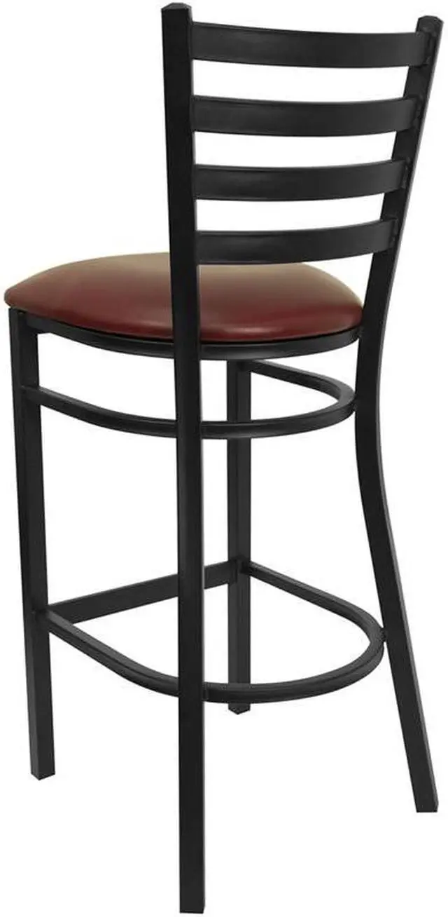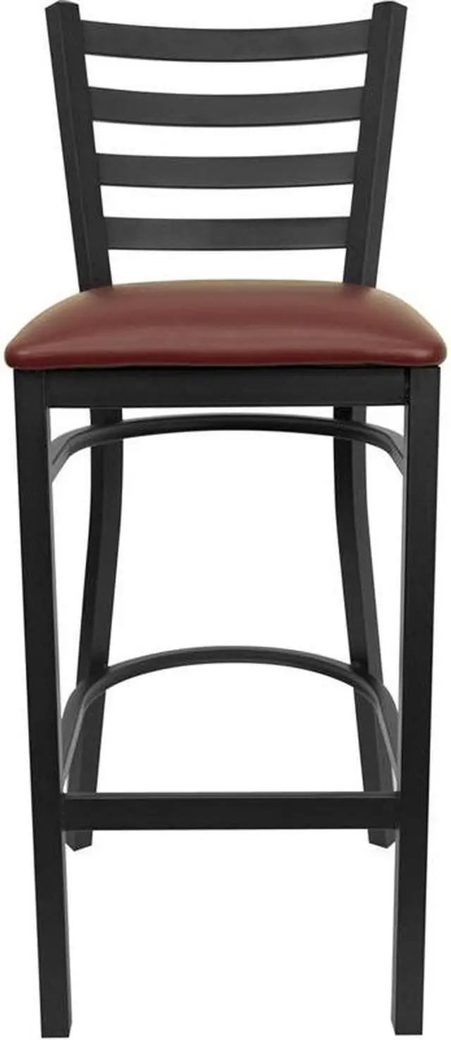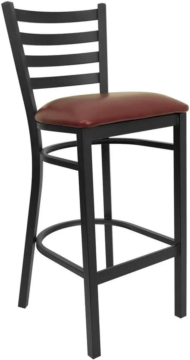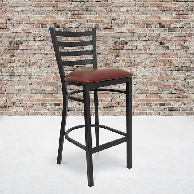 Create a first-rate dining experience by offering your patrons great food, service and attractive furnishings. Commercial furniture needs to be durable and low maintenance so metal barstools are a popular choice for furnishing restaurants, pool halls, lounges, bars and other high traffic establishments. This upholstered stool is easy to clean, which is an important aspect when it comes to a business. Built to withstand the everyday hustle and bustle in the restaurant and hospitality business, these dining stools will also look great in your home. The thick, foam padded seat and ladder back design will keep guests comfortable. The frame is stabilized using two welded support bars, which includes a footrest to prevent leg discomfort. The floor glides help protect your floors and ensure smooth gliding. Use this bar height stool in your kitchen, dining room or home bar and give your decor a fresh look. The simple and lightweight design of this stool will not disappoint, whether used in the home or your commercial business.Product Dimension-17"W x 18"D x 42.25"H