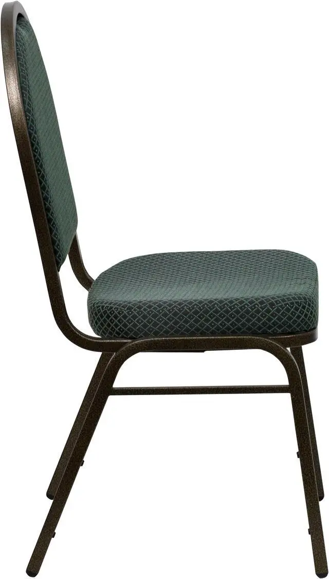 This beautiful, supremely comfortable banquet chair will ensure your guests have an enjoyable experience whether you're hosting the bride and groom, celebrating a sweet 16 or hosting the family reunion this well built chair is up to the task. The chair's seamless back panel and cushioned seat are generously padded and covered in durable green patterned fabric upholstery, The gently curved, dome back design gives a stylish look to any venue. Its sturdy 16 gauge steel, gold vein powder coated frame, with gracefully angled legs, has been tested to hold up to 500 pounds and floor protector glides protect your flooring by sliding smoothly when you need to move the chair.