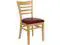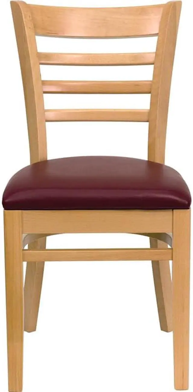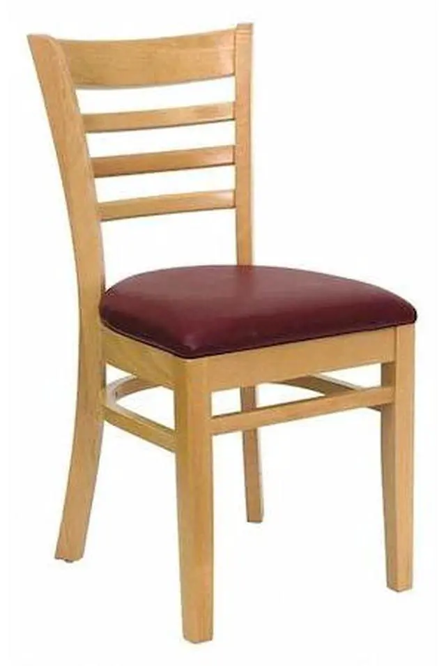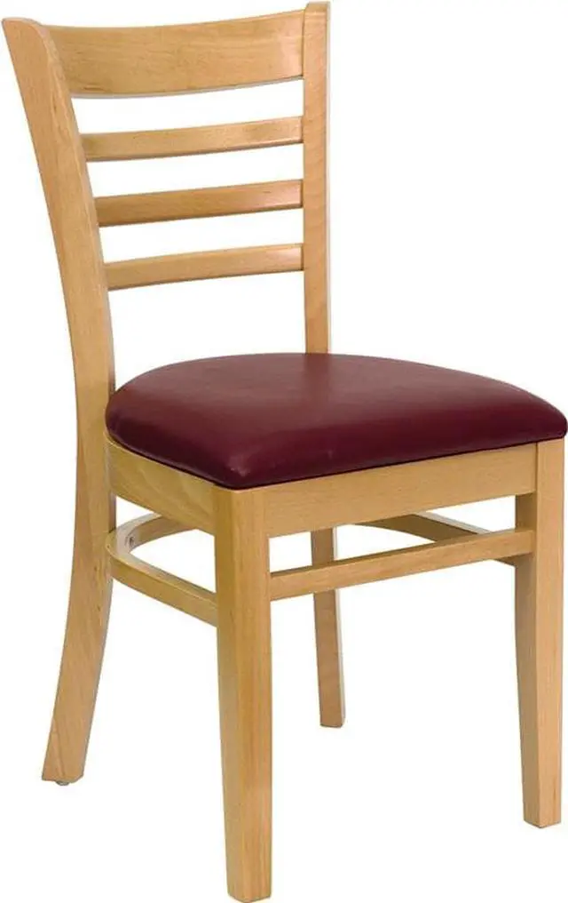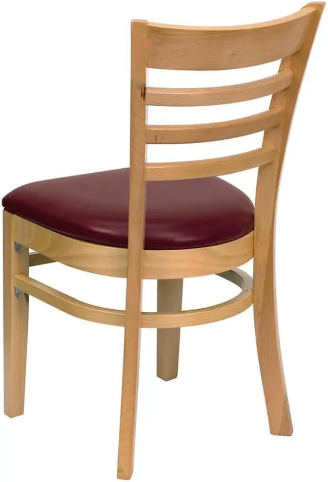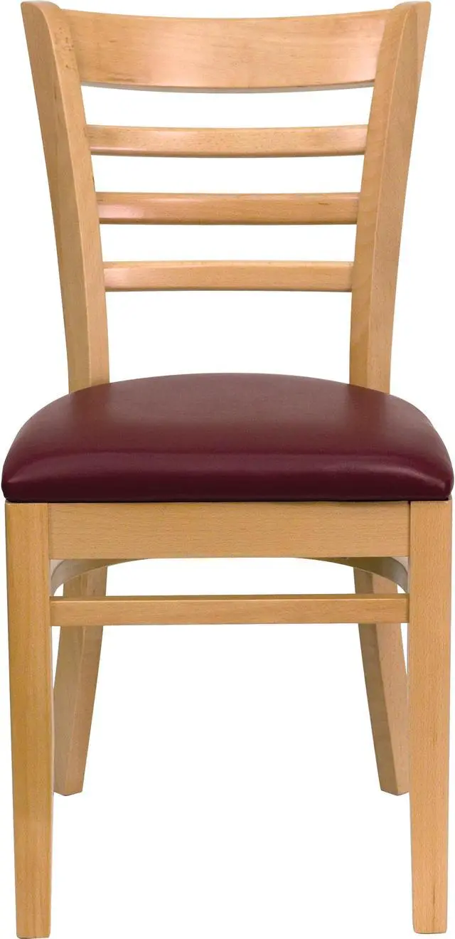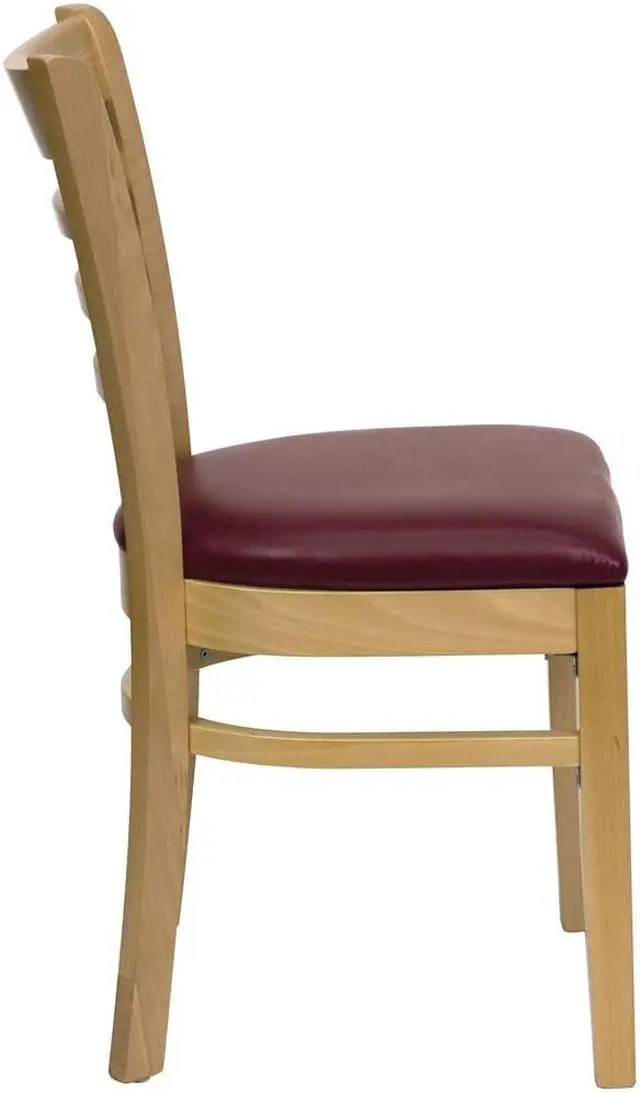 The ladder back design and thickly padded, burgundy vinyl upholstered seat will keep your guests comfortable. The durable frame is stabilized with mortise and tenon construction with metal wood screw reinforcements and a curved support bar for extra stability. The floor glides help protect your floors and ensure smooth gliding. This charmingly styled chair is a must have, whether used in the home or your commercial business.