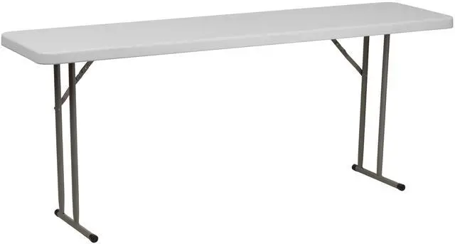 Fill that new designated training room with this narrow rectangular plastic folding table. The space saving design can fit multiple tables in small and large rooms making it the perfect training style table for any classroom or training facility. Have people pick up test packets and informational pamphlets on this perfectly sized folding table. Cleanup is simple on this durable, waterproof top to pick up spills quickly. This 6 foot folding table seats 3 people on one side of the table allowing all at the table a clear view of the board and instructor.
