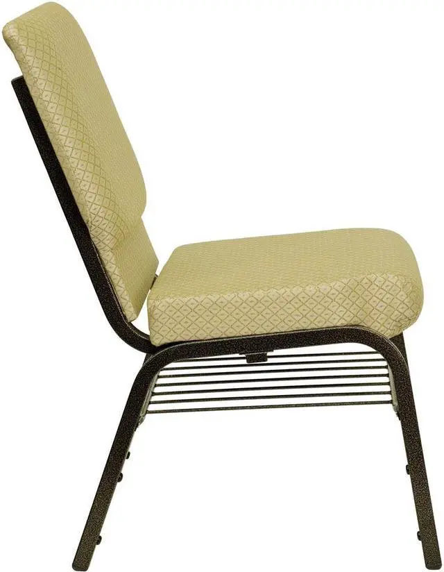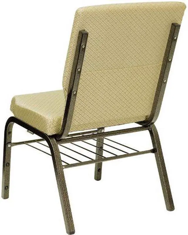 Built-in ganging brackets connect your chairs and maintain nice, straight rows. Its sturdy 16 gauge steel, gold vein frame, with gracefully angled legs, has been tested to hold up to 800 pounds and plastic rocker glides protect your floor by sliding smoothly when you need to move the chair. This Church Chair is an excellent option for hotel lobbies, banquet halls, conference facilities and worship centers.