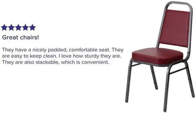 Host beautiful events no matter the occasion with banquet chairs, these stylish ballroom chairs are the right choice for casual and formal events. Built for the commercial industry these trapezoidal back banquet chairs have been tested to hold up to 500 pounds. With a high seating capacity these stack chairs are perfect for the event rental business. This standout hospitality chair can be used as is and still command attention or be dressed up for formal events by placing a chair cover over it. The chair is cushioned with 2.5" thick CAL 117 fire retardant foam and is covered in a durable, easy to clean vinyl upholstery.