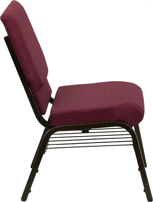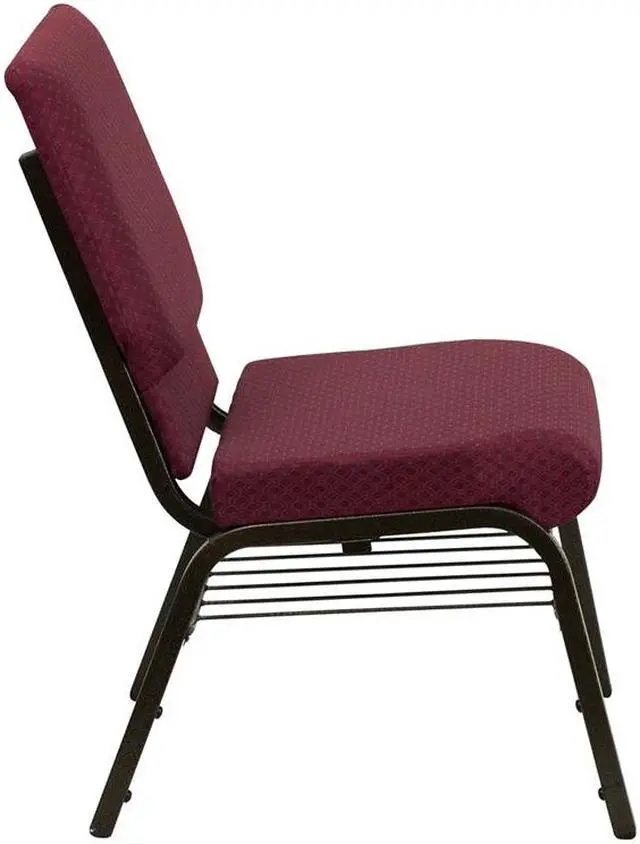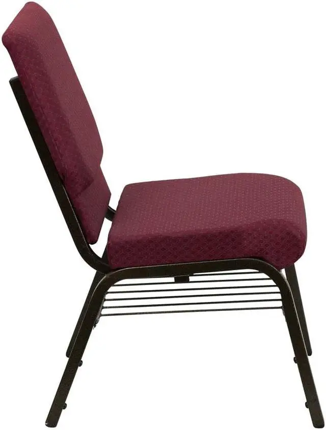 Built-in ganging brackets connect your chairs and maintain nice, straight rows. Its sturdy 16 gauge steel, gold vein frame, with gracefully angled legs, has been tested to hold up to 800 pounds and plastic rocker glides protect your floor by sliding smoothly when you need to move the chair. This Church Chair is an excellent option for hotel lobbies, banquet halls, conference facilities and worship centers.
