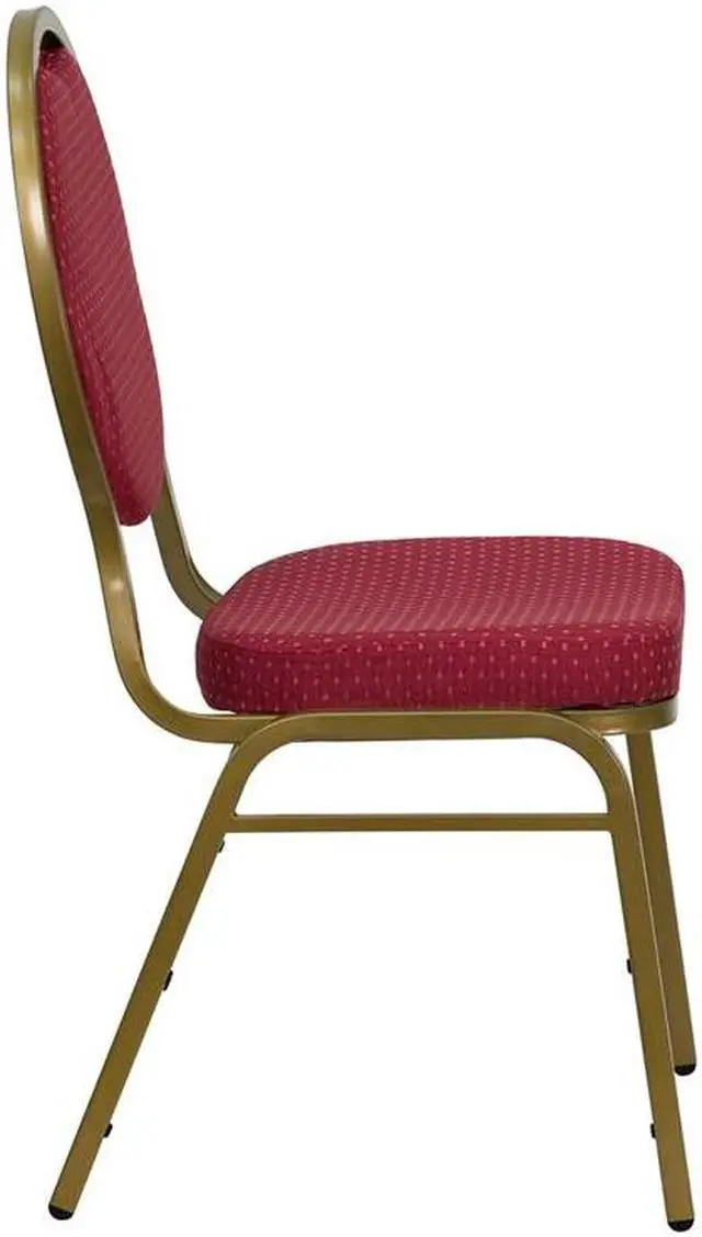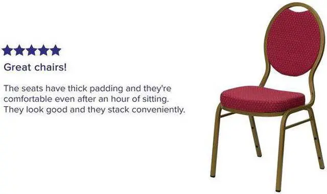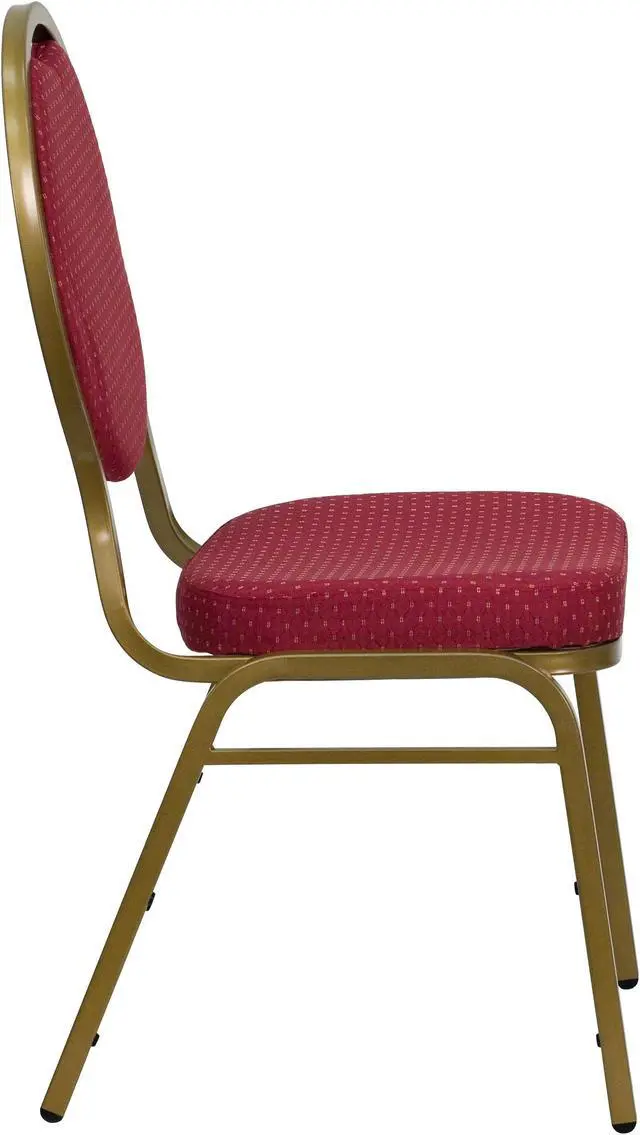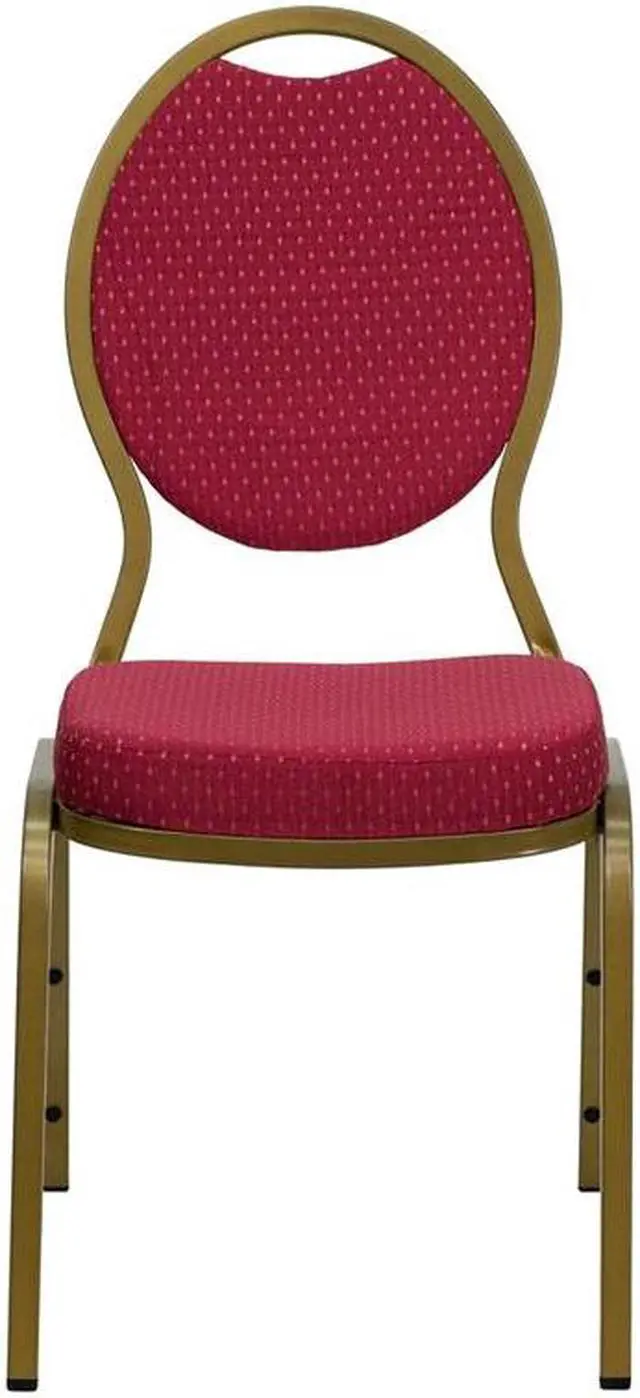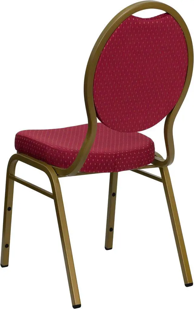 The right chair can elevate the look of your event. The effortless beauty of this commercial grade banquet chair with teardrop back design fits well in formal and casual settings from wedding ceremonies to corporate meetings and awards banquets. The chair's cushioned back and 2.5" thick foam seat are covered in beautiful red patterned fabric upholstery. Its sturdy, 16 gauge steel, gold powder coated frame, with gracefully angled legs, has been tested to hold up to 500 pounds. Double support braces reinforce the frame to give it great strength and durability.