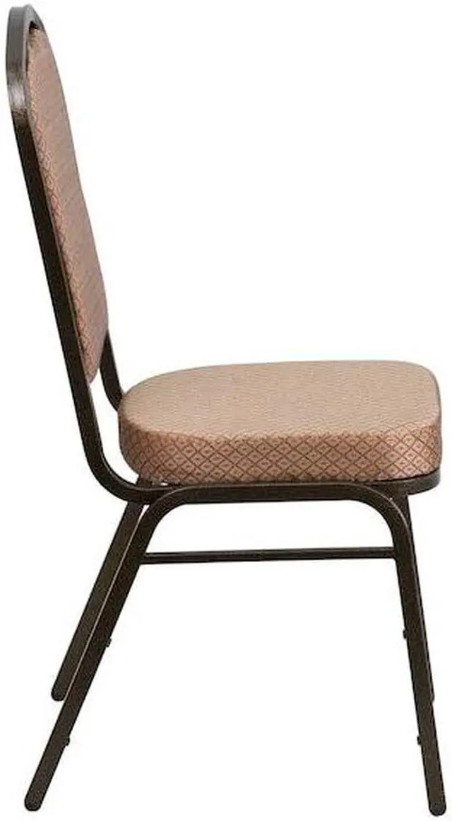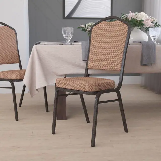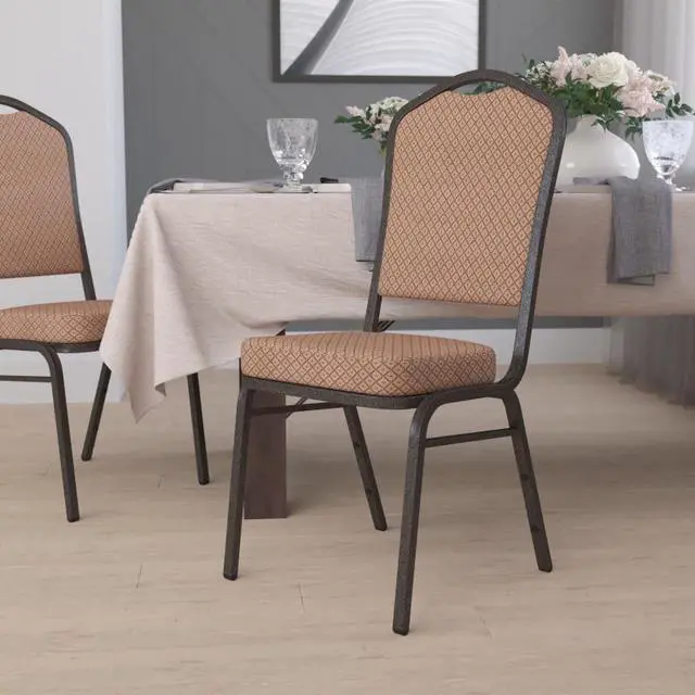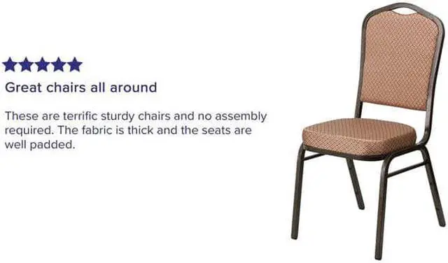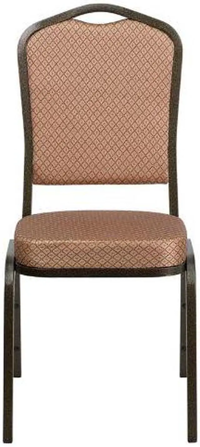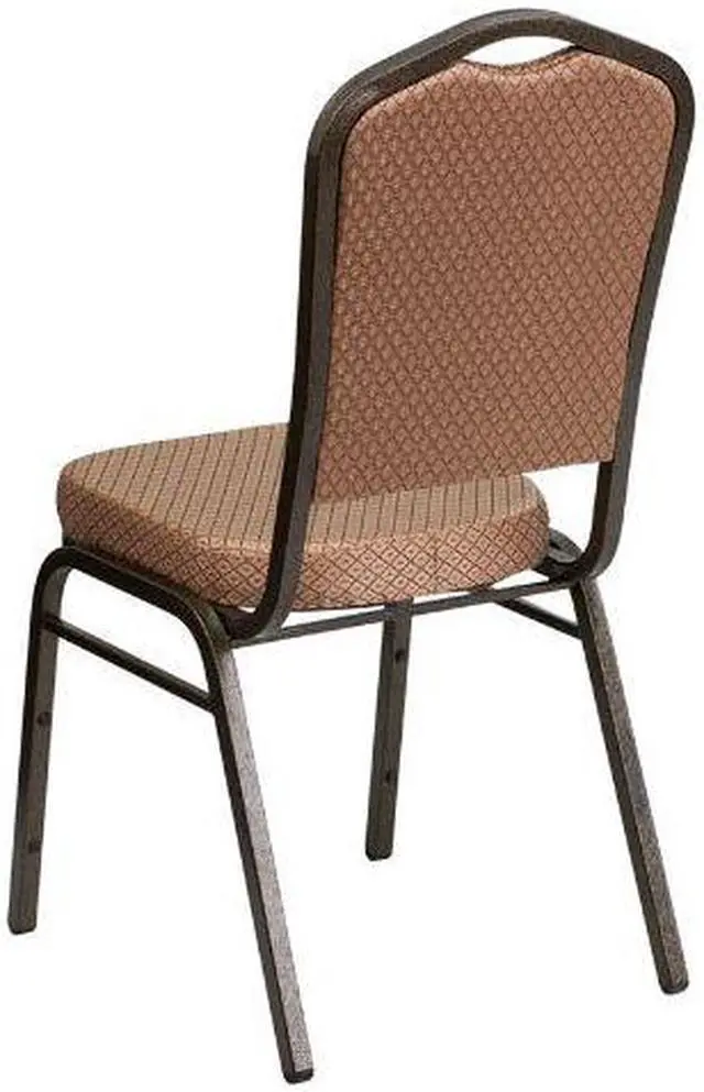 Make an impressive presentation in your banquet hall when clients come to visit your facility with these ballroom chairs. Built for the commercial industry these popular crown back banquet chairs have been tested to hold up to 500 pounds. With a high seating capacity these stack chairs are perfect for the event rental business. This standout hospitality chair can be used as is and still command attention or be dressed up for formal events by placing a chair cover over it. The chair is cushioned with 2.5" thick CAL 117 fire retardant foam and is covered in durable upholstery for high usage.