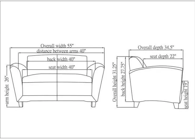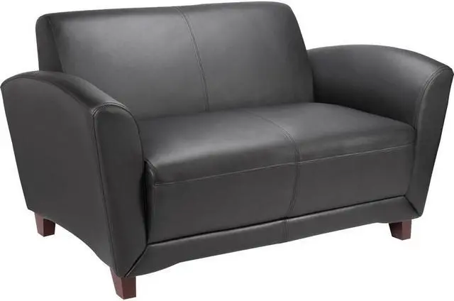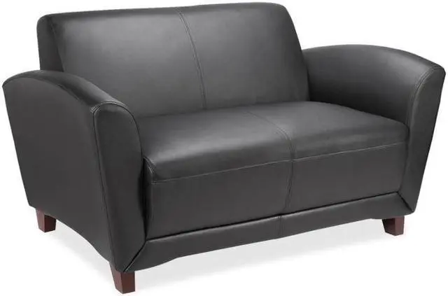Loveseat is part of the Lorell Reception Seating Collection that is made with an open, inviting modern design and bonded black leather. Back meets the seat at a slight obtuse angle for a relaxing wait. Sides rise for armrests. Comfortable, thick foam cushions are CA117 fire-retardant. Four sturdy, wooden legs with a Mahogany finish support the loveseat built for two. Overall weight capacity is 450 lb. with a 225 lb. capacity for each seat.