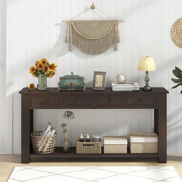 Spacious Storage: This 63-inch entryway table boasts a generous tabletop surface, perfect for placing decorative items or everyday essentials. It also features 4 spacious storage drawers for organizing smaller items and an open shelf for additional storage.