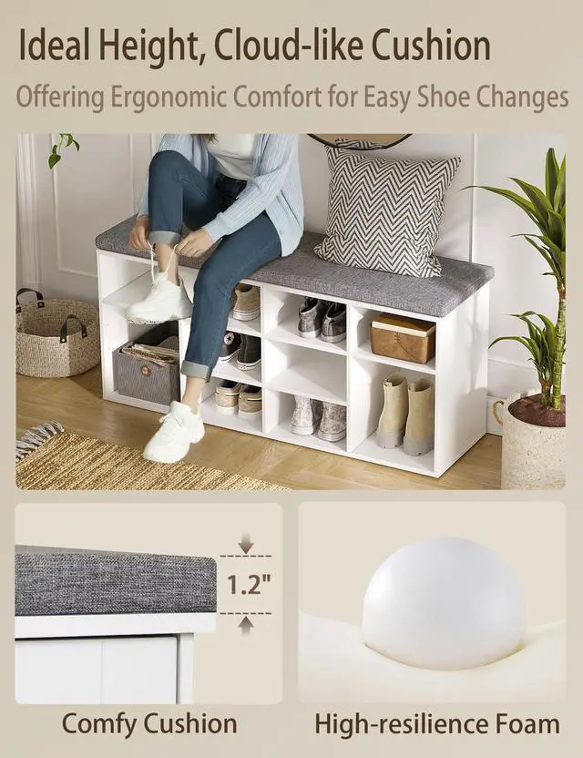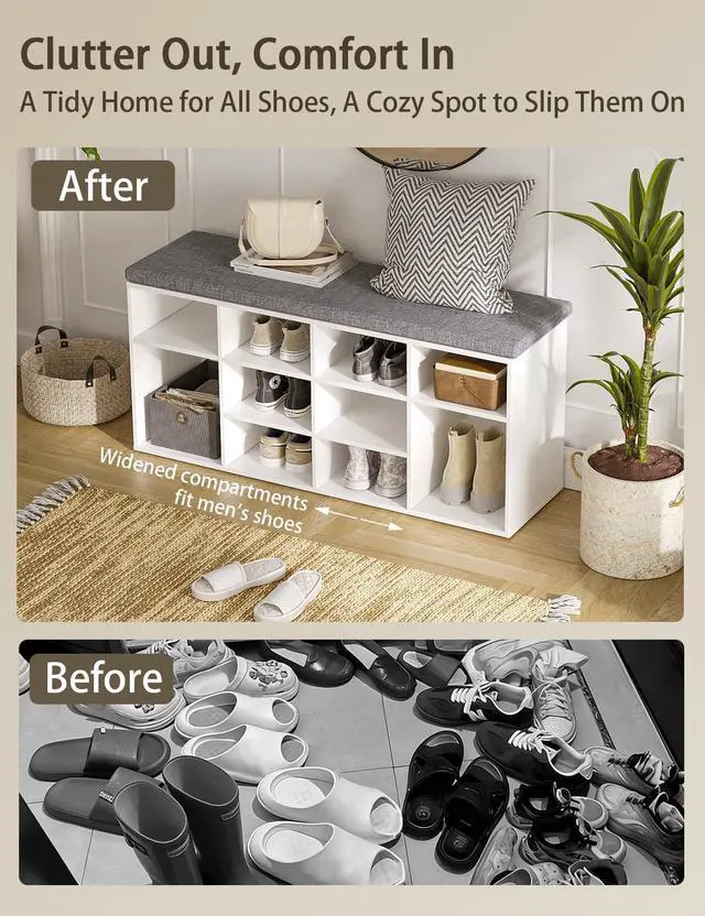 12 Storage Cubbies:This shoe bench entryway holds 10-12 pairs of shoes to meets your daily shoes organization, which keeps your entryway, front door or hallway neat and tiddy. This compact and narrow shoe organizer bench fits in entry porch, living room, bedroom, closets and garage perfectly. Easy to move and use/