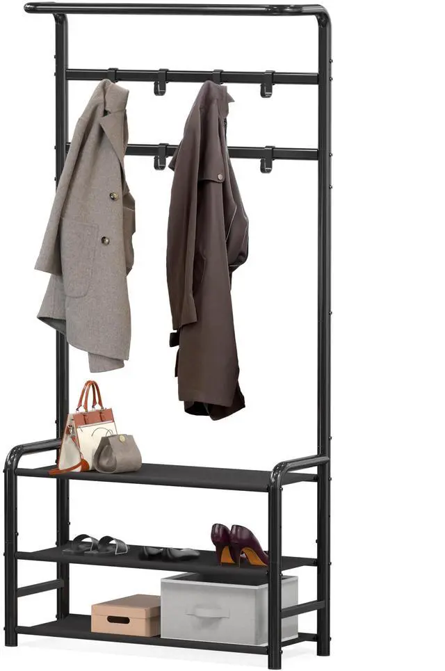 Freestanding Clothing Rod with Shoe Storage and Adjustable Hooks
