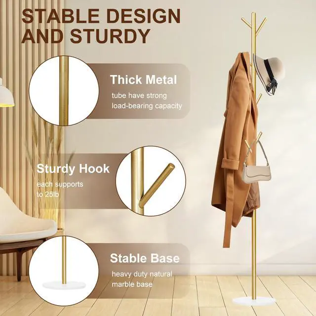 Coat Rack, Metal Freestanding Coat Rack with 8 Hooks, Sturdy Coat Tree with Natural Marble Base for Coats, Hats, Scarves and Handbags for Entryway, Hallway, Bedroom, Office, Dorm (Gold)