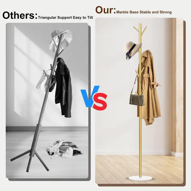 UPGRADE VERSION NATURAL MARBLE BASEOur free standing coat rack base is made of a whole piece of natural marble. The base has been upgraded with a compact size of only 9.8 inches, smaller than those commonly available on the market. It delivers the same excellent stability while being more space-saving and easier to move.
