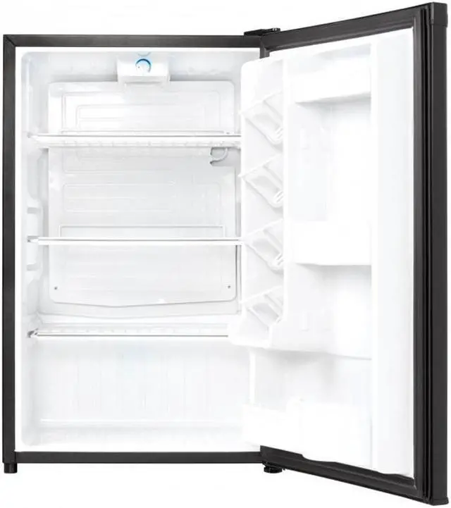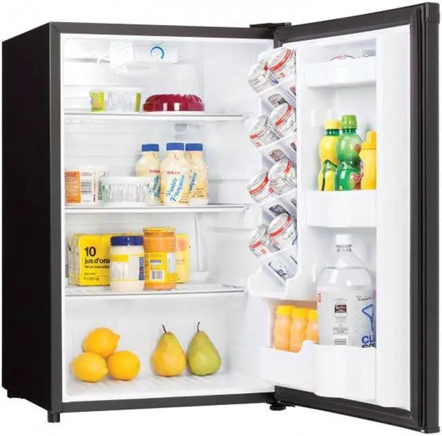 Enjoy large storage capacity in a compact size with the Danby 4.4-Cubic Foot Mini Refrigerator. Featuring a flat-back design, integrated door handle, and reversible door hinge, this mini refrigerator is an ideal choice for apartments, dorms, and other areas where space is limited. This refrigerator is Energy Star-compliant for low power usage, and uses a mechanical thermostat to deliver accurate cooling and temperature control. The Danby mini fridge has 2.5 wire shelves that slide out for maximum convenience and easy cleaning, while integrated door shelving with specific can and tall-bottle storage helps keep the fridge organized while maximizing storage space.