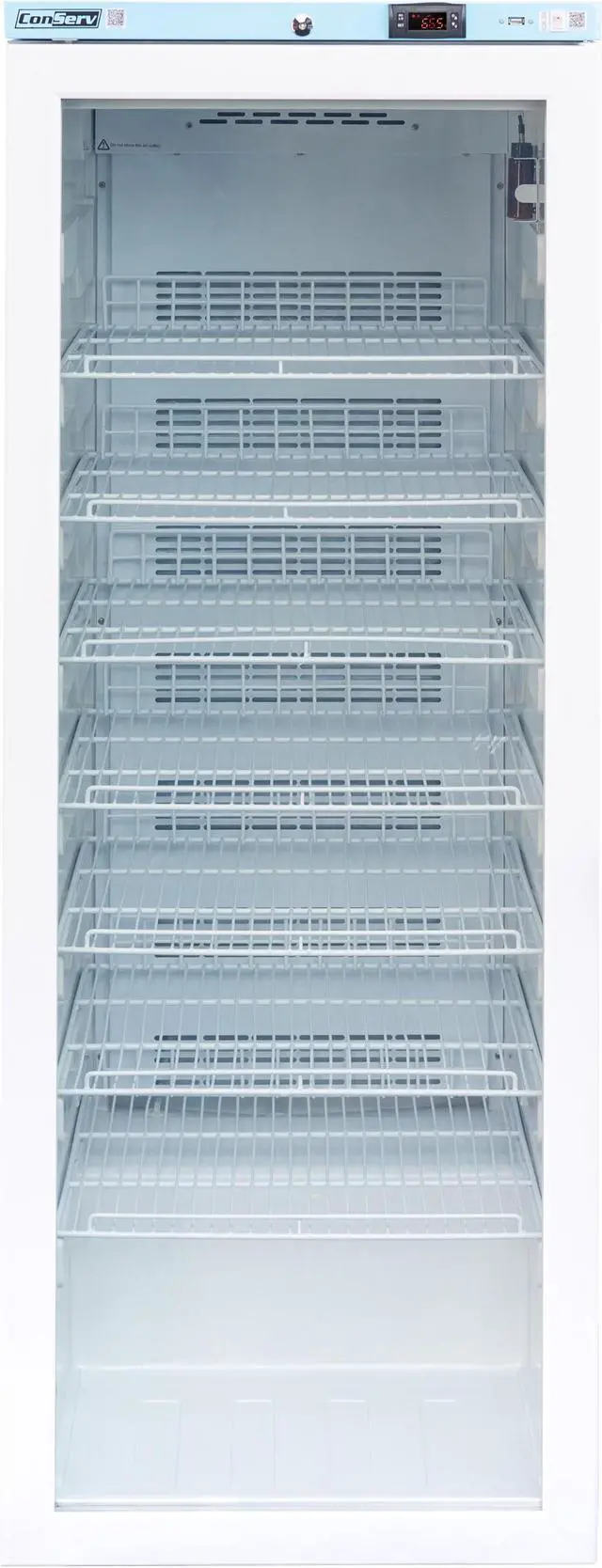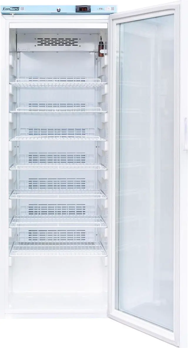 The Equator Medical Refrigerator CMV 1300 G protects your medicines and vaccines with precision cooling. As a frost-free pharmaceutical refrigerator, the unit is 65 x 23 x 28 and comes with adjustable feet to complement slight height variations for the refrigerators freestanding installation. The vaccine refrigerator also features an electronic display for controls that adjust the 7 settings including Refrigeration, Fan, Defrosting, Alarm, Lighting, and more. It come with 4 grill shelves, is button controlled, has a key lock for safety, and has a spacious 12.7 cu ft capacity.