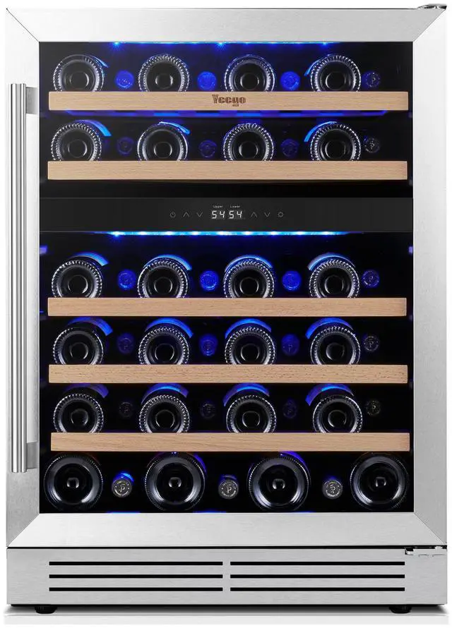 Dual Zone Temperature] Holds up to 46 bottles. The dual-zone control is suitable for all types of wine. It comes with 5 premium wire-wood shelves which are removable, slide smoothly and are strong enough to support bottles without scratching. This enables you to easily store wine bottles of different shapes and sizes.