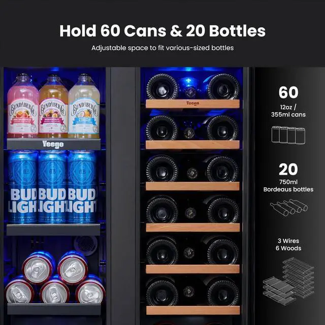 Spacious Capacity: Accommodates 18 standard wine bottles (750ml) and 60 beverage cans (12oz) across dedicated compartments.