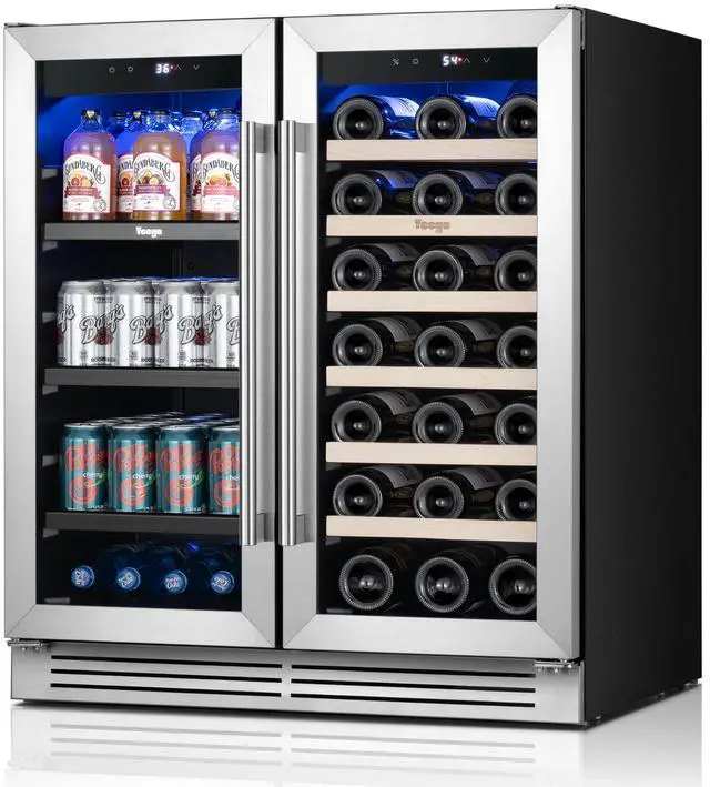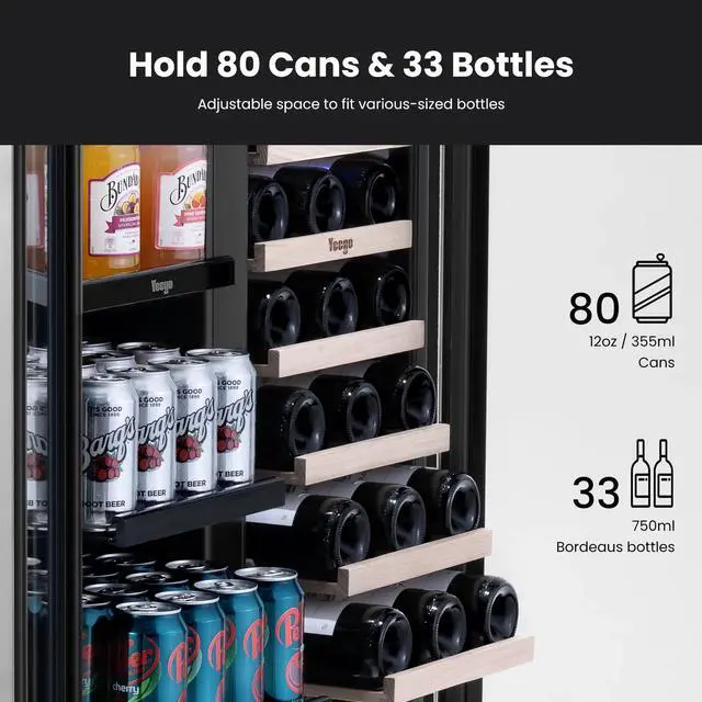 Spacious Capacity: Accommodates 18 standard wine bottles (750ml) and 60 beverage cans (12oz) across dedicated compartments.